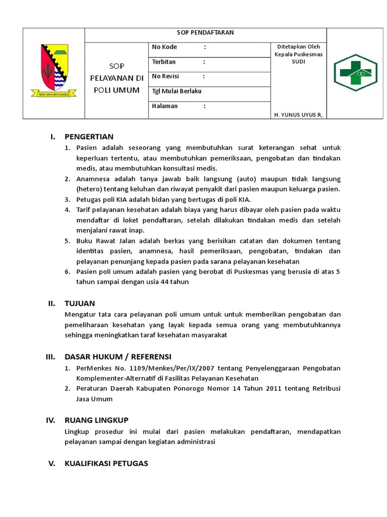 Sesampainya di unit pelayanan dengan sikap ramah petugas melayani pasien sesuai dengan sop yang ada. Dipublikasi pada 19 mei 2018 oleh aep nurul hidayah. Kami mengulas tentang contoh sop pelayanan poli umum di pkm. Perawat poli mempersilahkan pasien poli lansia untuk menuju ke tempat pemeriksaan khusus lansia, dan mengkonfirmasikan ke pada pasien lansia untuk menunggu giliran. 10) tindakan yang dilakukan dicatat dalam buku rawat jalan. Demikianlah beberapa ulasan artikel tentang sop dokter umum yang dapat anda jadikan referensi untuk mengetahui lebih jauh mengenai sop dokter umum. 4 januari 2018 halaman : sop poli umum diagram alur. Standar pelayanan pelayanan dalam gedung i. Pelayanan yang ditangani di poli kandungan& Dan untuk pasien yang telah ditindaki pada poli gigi diberikan resep oleh dokter gigi untuk mengambil obat di apotik. sop pengajuan uang lembur pegawai. Bagi pasien umum, menyelesaikan administrasi pembayaran di loket pembayaran.